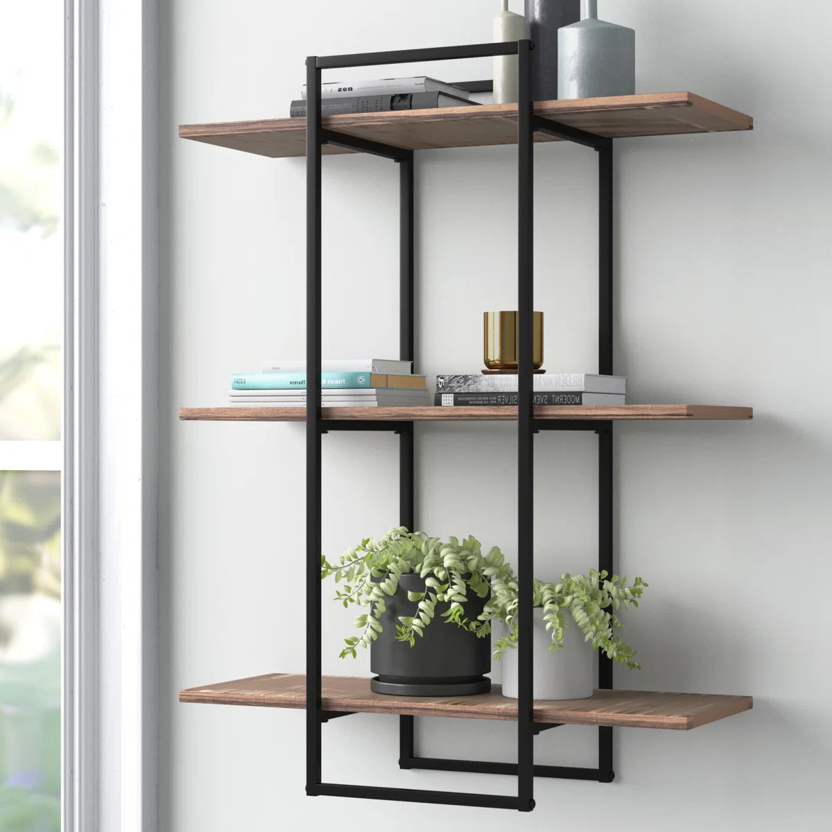 • This 3-piece tiered shelf provides storage and adds decorative appeal to your living space. The matte black frame supports three shelves measuring just under 24” wide.