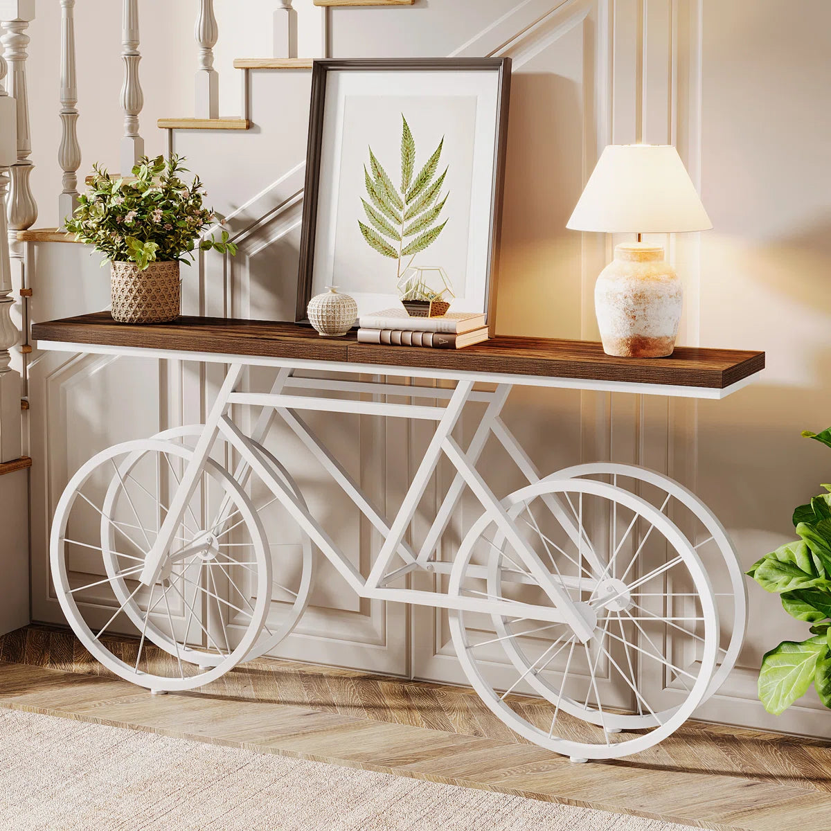 • The audacious charm of this entryway table breathes new life into your space, transforming it into a creative haven. Its unique bicycle metal base is the epitome of innovative design, adding an unconventional yet stylish twist.