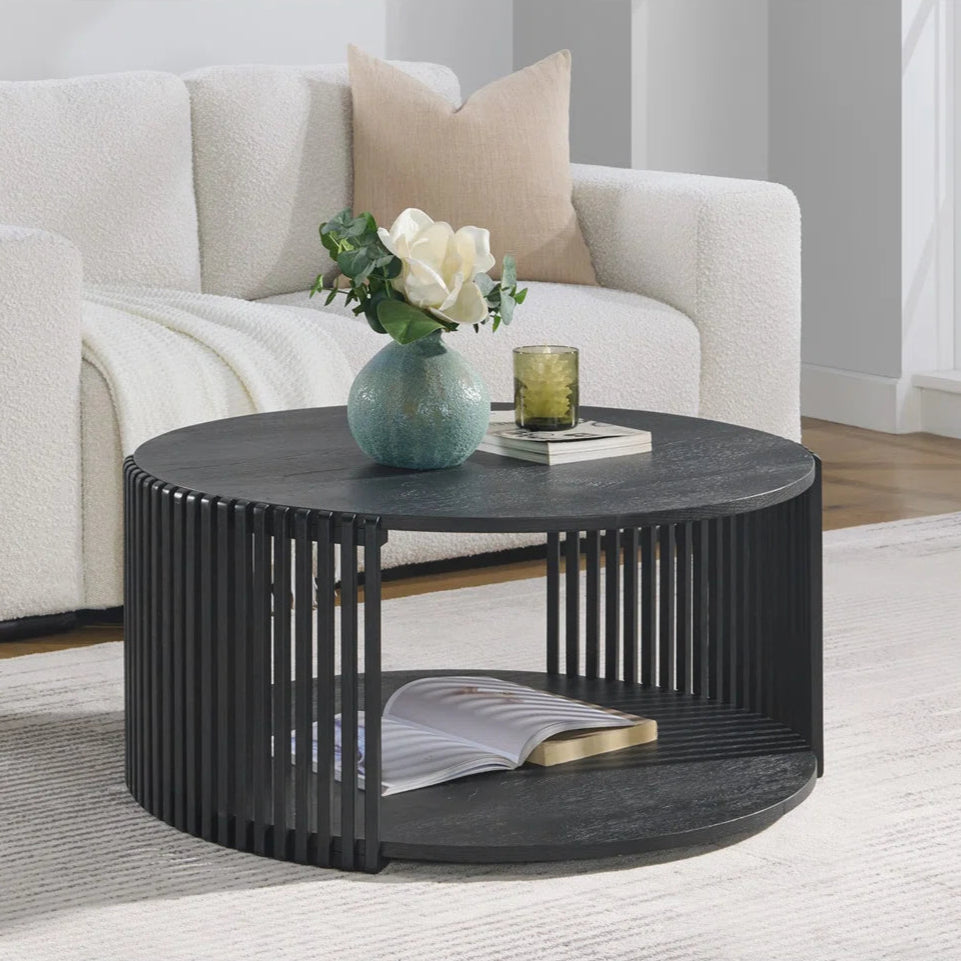 • This round wood coffee table features an open concept design, with spindle slats along the sides, exposing a bottom shelf that is perfect for housing reading materials or showcasing decorative accessories.