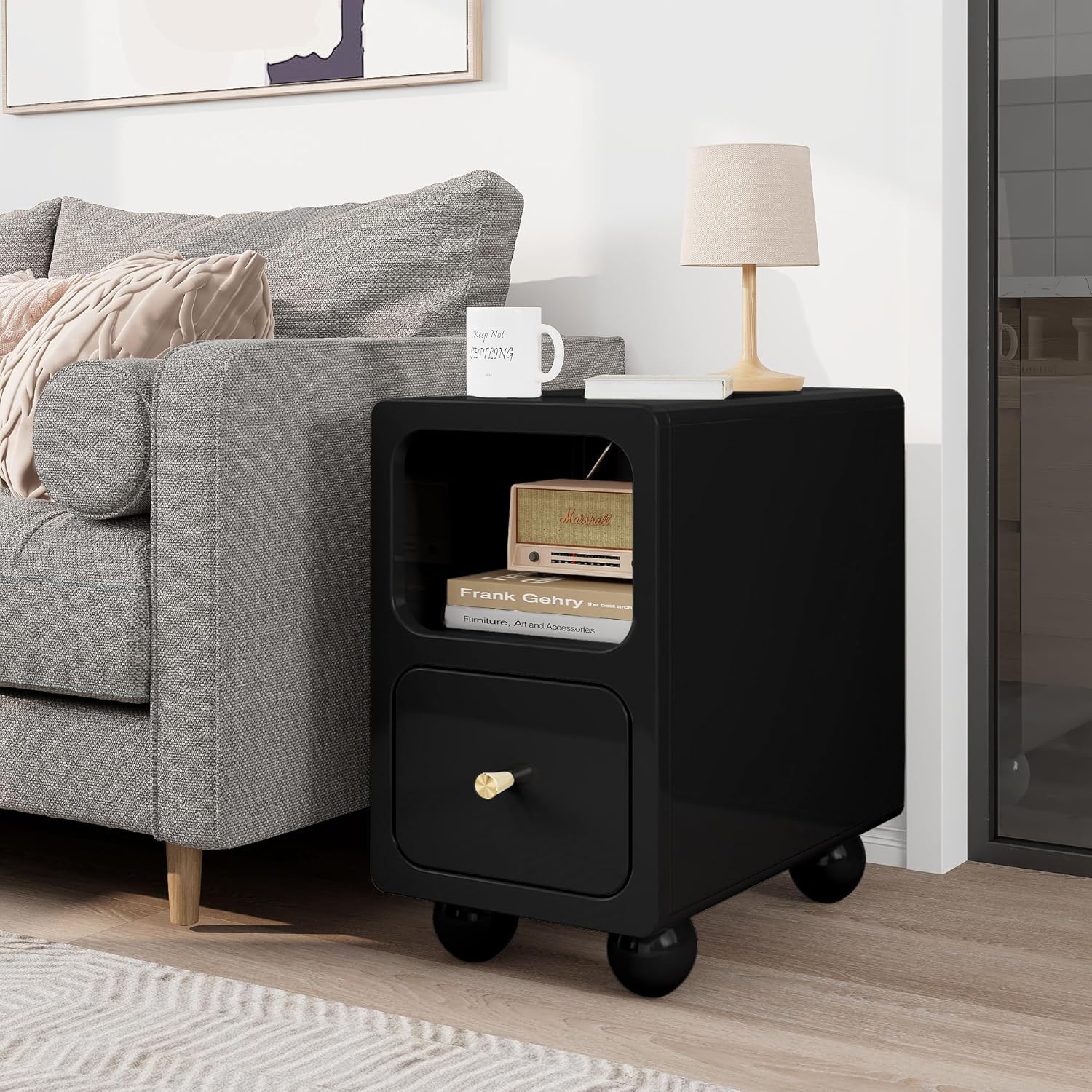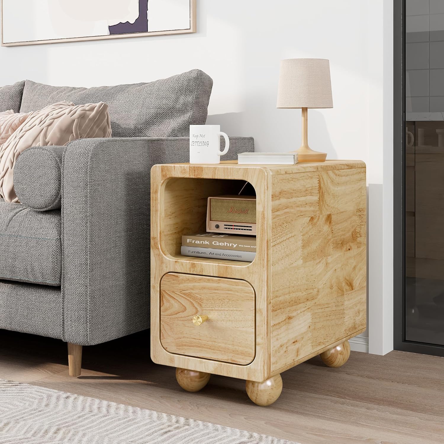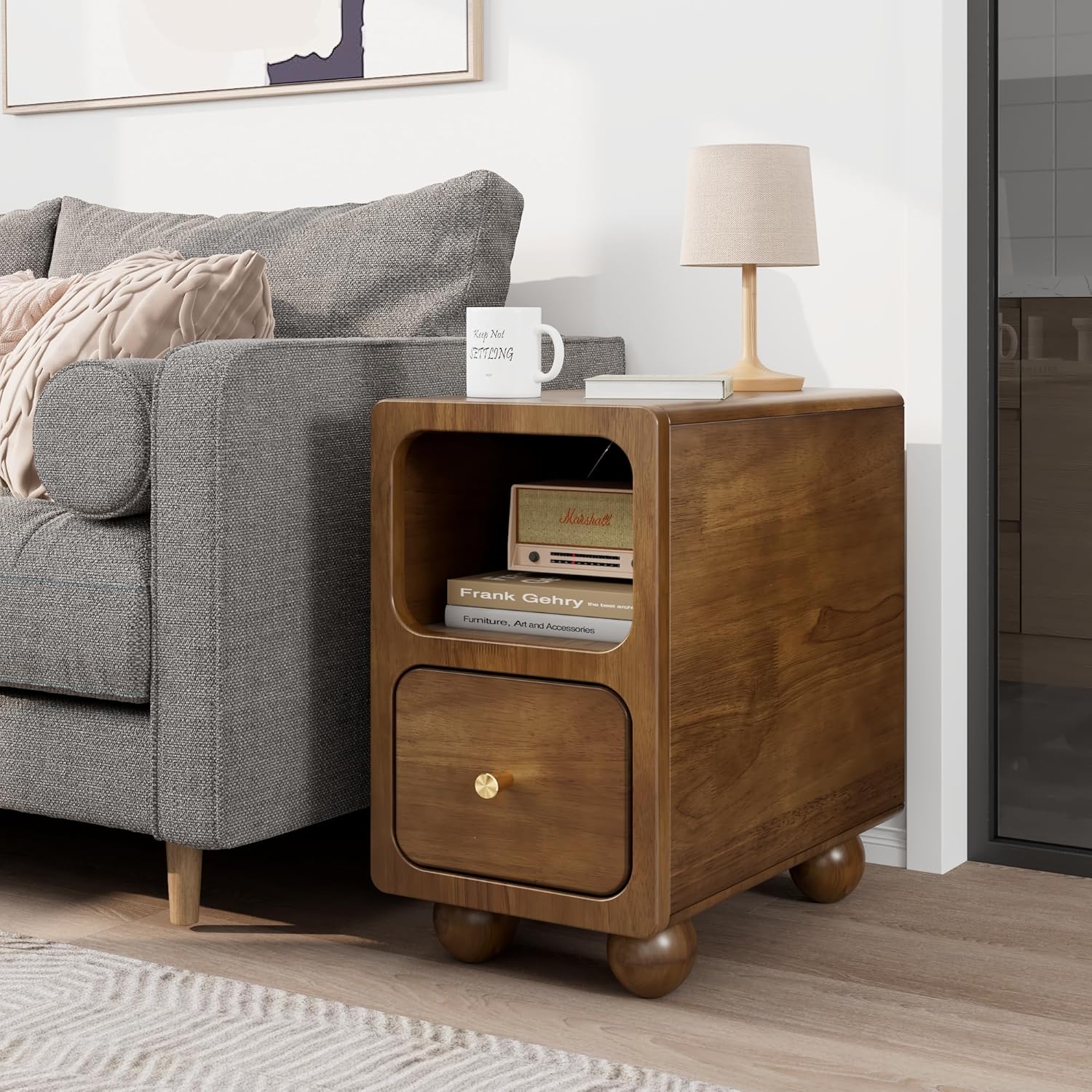 • The convenient drawer provides storage for essentials like books, remotes, or personal items.