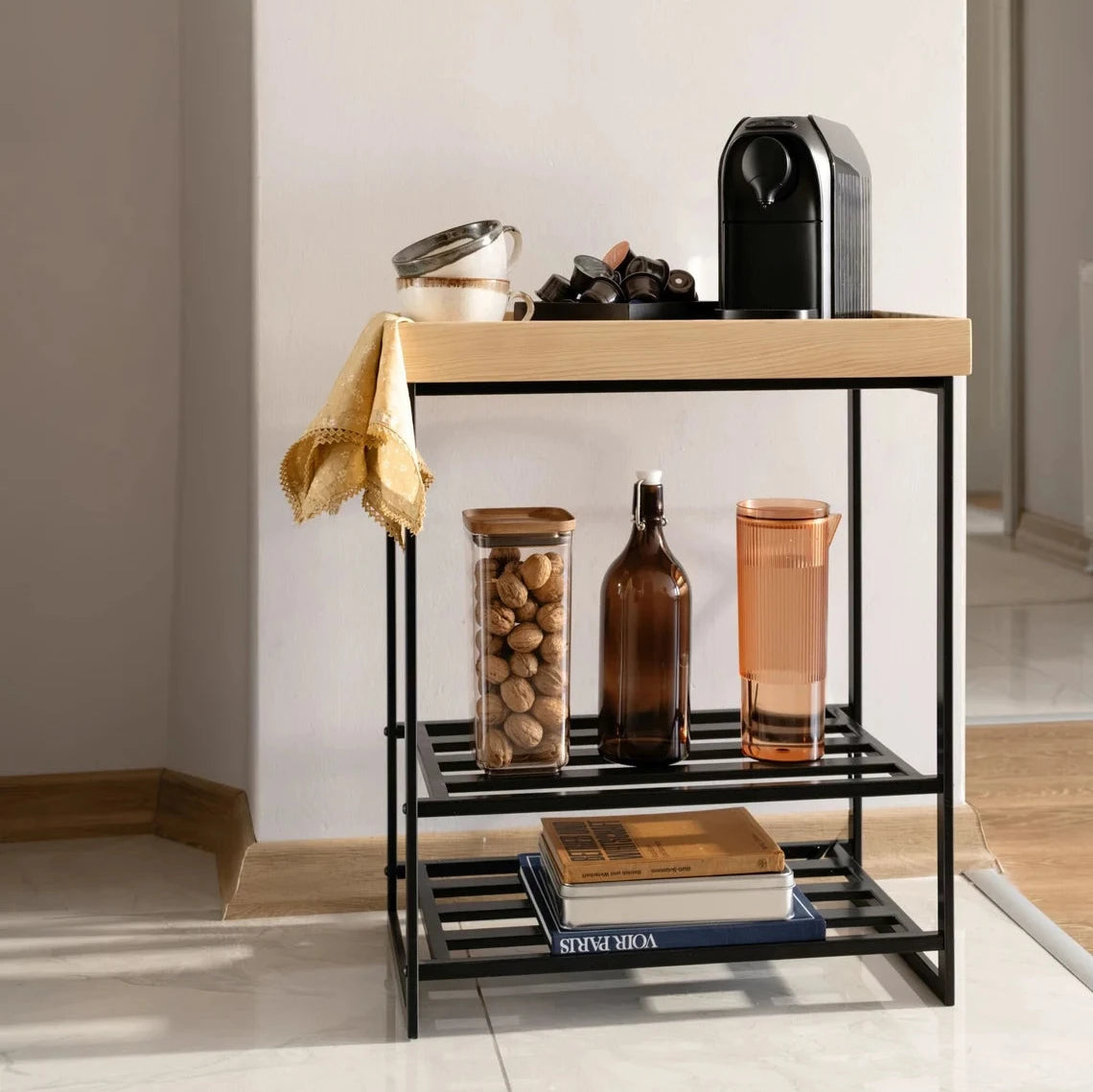• This minimalist shoe rack is a wonderful product with its wooden tray-shaped detail on the top.