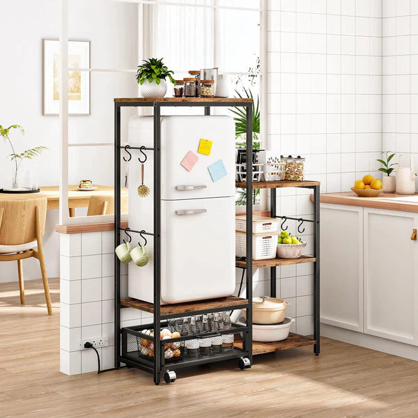 • Spice bottles, pots, plates, microwaves, rice cookers, spoons, and much more may be stored in the 5-tier baker's rack's multi-layered design, which includes different-sized sections, a durable metal grid, and 11 S-shaped hooks.